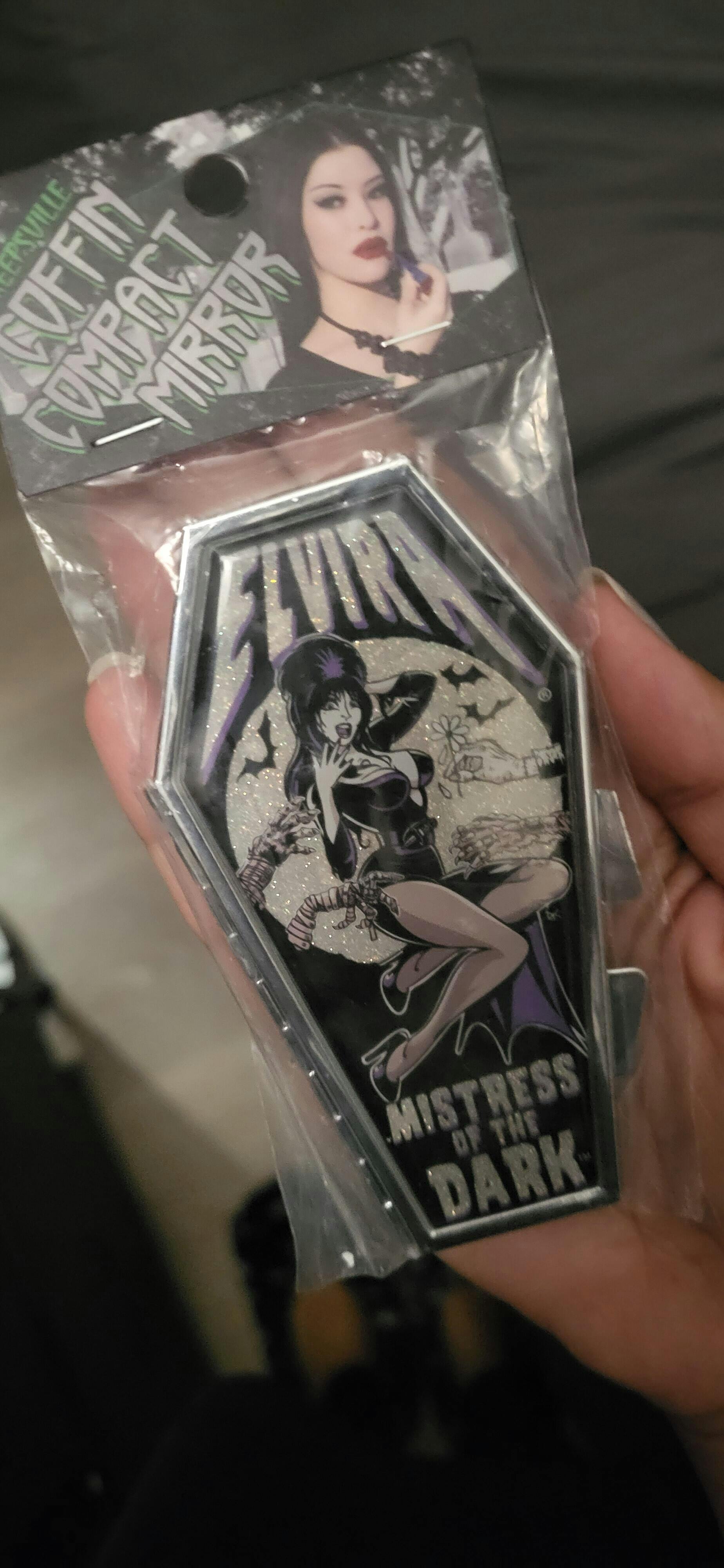 Officially licensed Elvira Mistress of the Dark Monster Hands Glitter coffin shaped compact mirror, perfect for keeping your 80s glam makeup fierce on the go. This handy coffin compact features glittering art by Dave Cook, includes one non-magnified mirror and one magnified mirror inside, and fits perfectly in your purse or pocket so you can stay looking your best all through the night. Size approx 4" X 2". Designed in California. I have a lot of other styles of these in my closet as well. punk rockabilly!